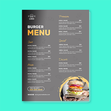Take your menu to the next level with our high-quality laminated menus, featuring vibrant digital full-color printing. Our menus are designed to make your offerings stand out and withstand the wear and tear of daily use.